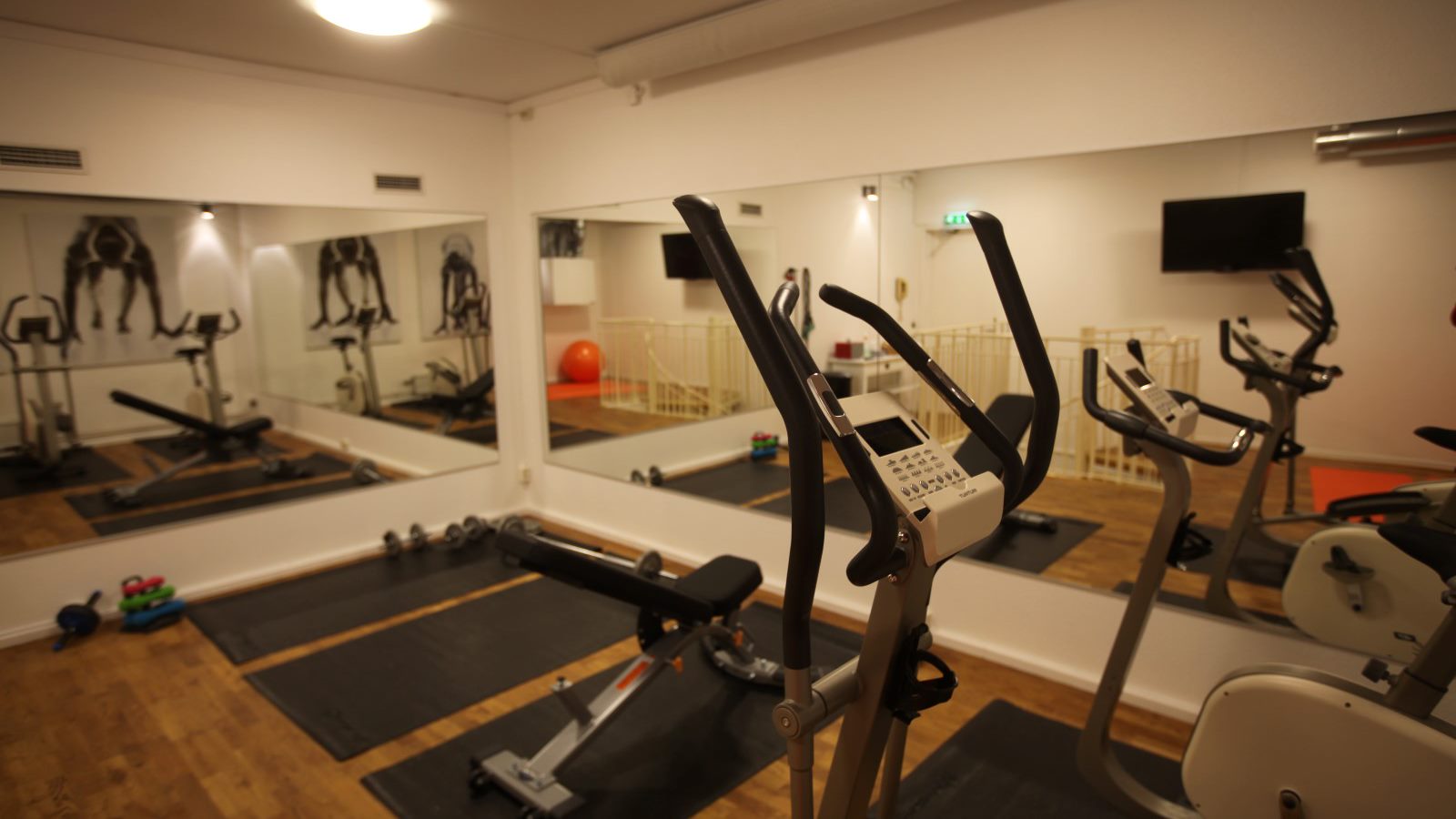 Vi har även ett mindre motionsrum på hotellet, med begränsat antal träningsredskap.