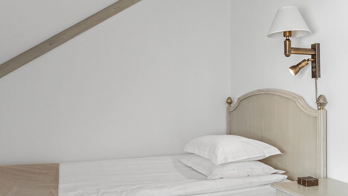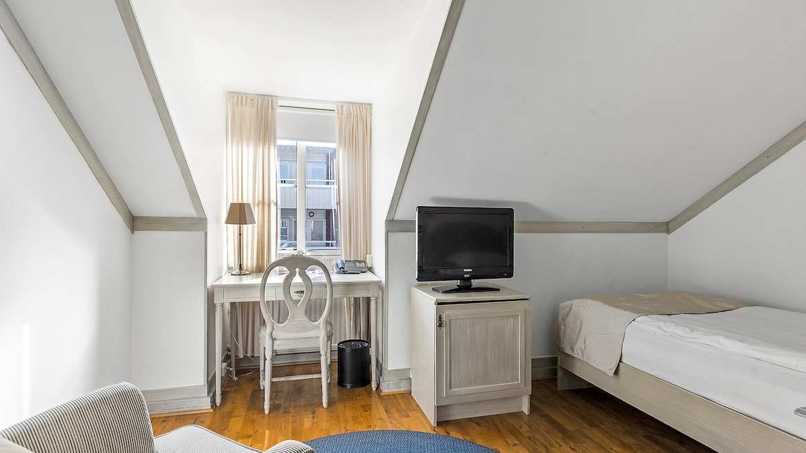 Våra mysiga enkelrum med charmiga snedtak erbjuder en bekväm och praktisk vistelse.