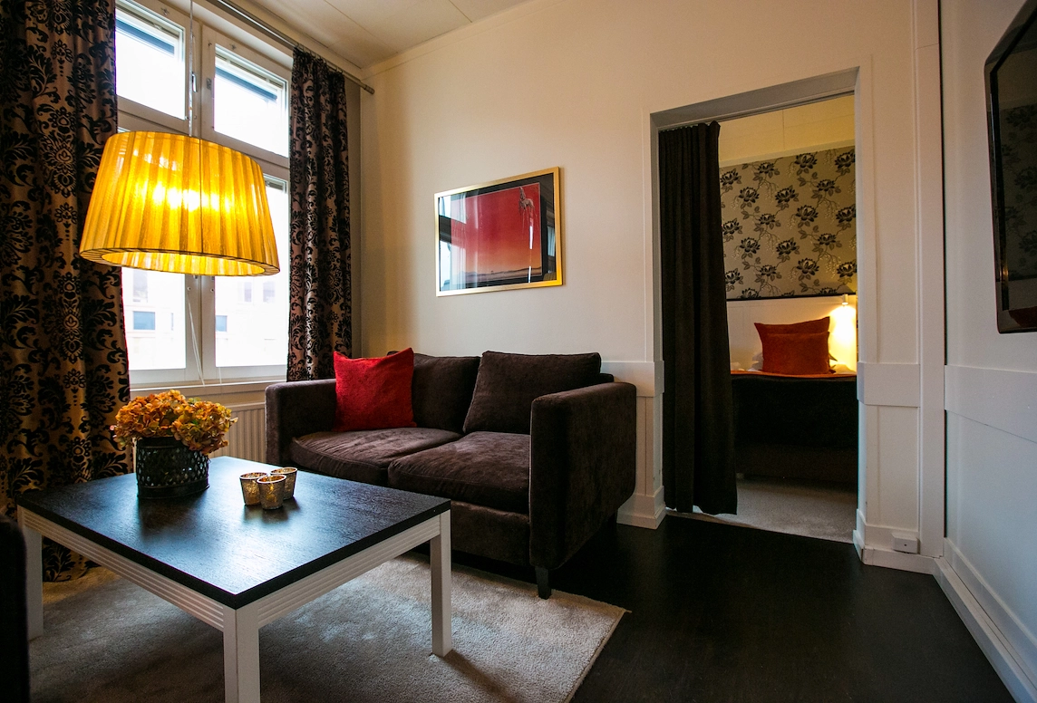 Våra två charmiga sviter är unikt inredda och har separata sovrum och loungerum. Sovrummet har en bekväm king size-säng och i loungen finns två sköna soffor.